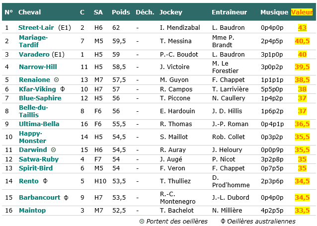 La VALEUR est la valeur théorique de chaque cheval établie selon ses performances passées, et mise à jour selon chaque performance. Elle sert à calculer le poids porté dans les handicaps, mais aussi, naturellement, à situer la qualité respective des chevaux entre eux.